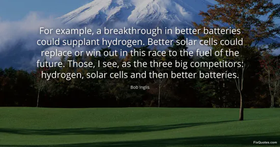 Inglis, Bob. "For example, a breakthrough in better batteries could supplant hydrogen. Better solar cells could replace or win out in this race to the fuel of the future. Those, I see, as the three big competitors: hydrogen, solar cells and then better batteries." FixQuotes. January 17, 2026. https://fixquotes.com/quotes/for-example-a-breakthrough-in-better-batteries-48854/.