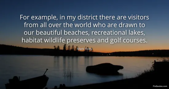 Foley, Mark. (2026, January 17). For example, in my district there are visitors from all over the world who are drawn to our beautiful beaches, recreational lakes, habitat wildlife preserves and golf courses. FixQuotes. https://fixquotes.com/quotes/for-example-in-my-district-there-are-visitors-61357/