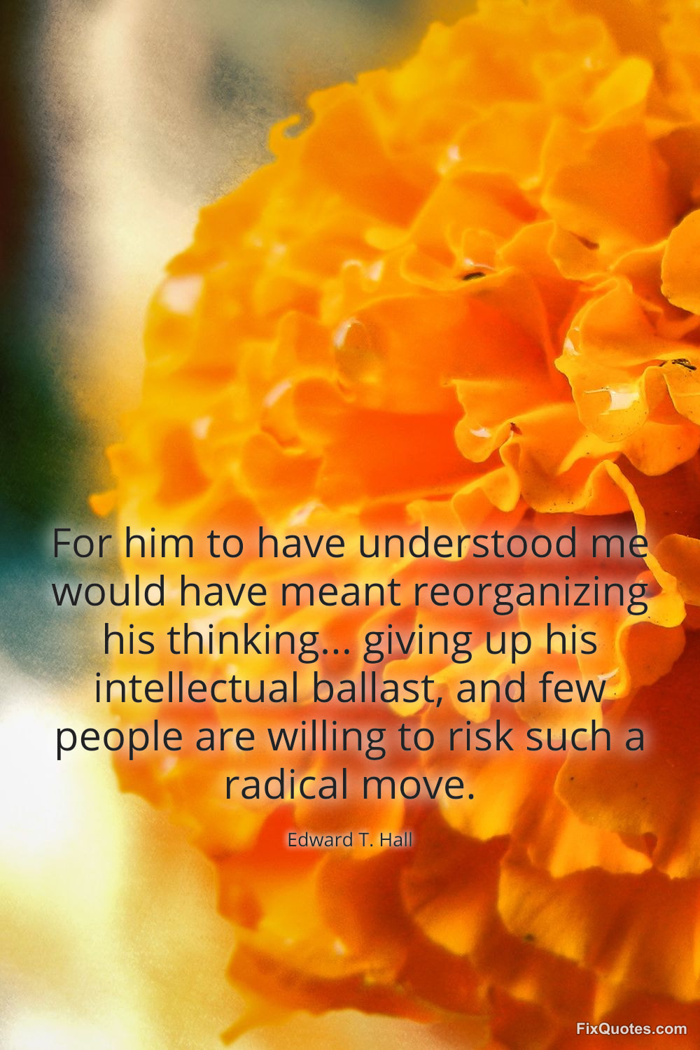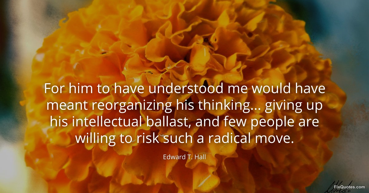 Hall, Edward T. "For him to have understood me would have meant reorganizing his thinking... giving up his intellectual ballast, and few people are willing to risk such a radical move." FixQuotes. January 16, 2026. https://fixquotes.com/quotes/for-him-to-have-understood-me-would-have-meant-131554/.