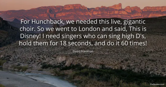 Friedman, David. "For Hunchback, we needed this live, gigantic choir. So we went to London and said, This is Disney! I need singers who can sing high D's, hold them for 18 seconds, and do it 60 times!" FixQuotes. January 17, 2026. https://fixquotes.com/quotes/for-hunchback-we-needed-this-live-gigantic-choir-39110/.