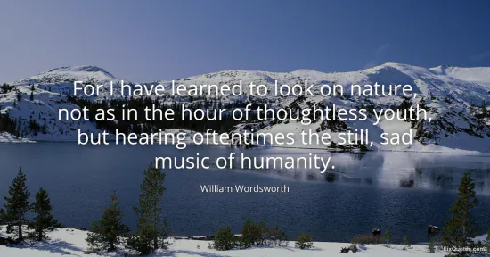 "For I have learned to look on nature, not as in the hour of thoughtless youth, but hearing oftentimes the still, sad music of humanity." FixQuotes, 15 Jan. 2026, https://fixquotes.com/quotes/for-i-have-learned-to-look-on-nature-not-as-in-3432/. Accessed 12 Feb. 2026.