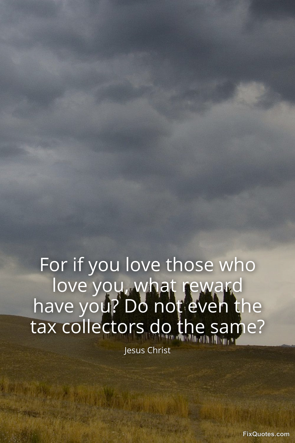 "For if you love those who love you, what reward have you? Do not even the tax collectors do the same?" FixQuotes, 18 Feb. 2026, https://fixquotes.com/quotes/for-if-you-love-those-who-love-you-what-reward-185627/. Accessed 26 Feb. 2026.