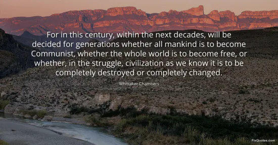 Chambers, Whittaker. (2026, January 16). For in this century, within the next decades, will be decided for generations whether all mankind is to become Communist, whether the whole world is to become free, or whether, in the struggle, civilization as we know it is to be completely destroyed or completely changed. FixQuotes. https://fixquotes.com/quotes/for-in-this-century-within-the-next-decades-will-100070/