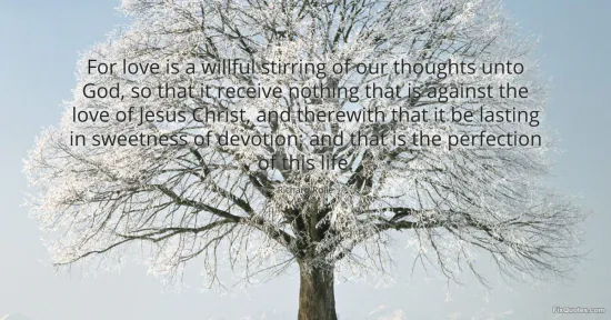 "For love is a willful stirring of our thoughts unto God, so that it receive nothing that is against the love of Jesus Christ, and therewith that it be lasting in sweetness of devotion; and that is the perfection of this life." FixQuotes, 16 Jan. 2026, https://fixquotes.com/quotes/for-love-is-a-willful-stirring-of-our-thoughts-102045/. Accessed 12 Feb. 2026.