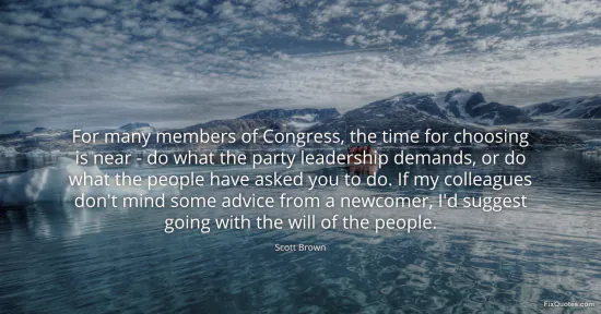 Brown, Scott. "For many members of Congress, the time for choosing is near - do what the party leadership demands, or do what the people have asked you to do. If my colleagues don't mind some advice from a newcomer, I'd suggest going with the will of the people." FixQuotes. January 16, 2026. https://fixquotes.com/quotes/for-many-members-of-congress-the-time-for-90656/.