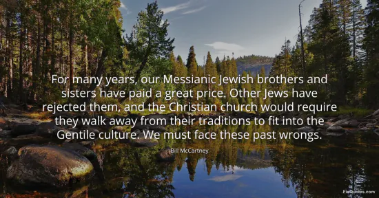 McCartney, Bill. "For many years, our Messianic Jewish brothers and sisters have paid a great price. Other Jews have rejected them, and the Christian church would require they walk away from their traditions to fit into the Gentile culture. We must face these past wrongs." FixQuotes. January 15, 2026. https://fixquotes.com/quotes/for-many-years-our-messianic-jewish-brothers-and-167051/.