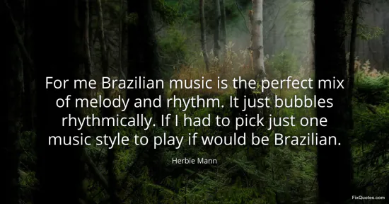 Mann, Herbie. (2026, January 17). For me Brazilian music is the perfect mix of melody and rhythm. It just bubbles rhythmically. If I had to pick just one music style to play if would be Brazilian. FixQuotes. https://fixquotes.com/quotes/for-me-brazilian-music-is-the-perfect-mix-of-68940/