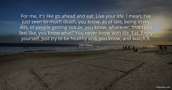 Mazar, Debi. "For me, it's like go ahead and eat. Live your life. I mean, I've just seen so much death, you know, as of late, being in my 40s, of people getting sick or, you know, whatever, that I just feel like, you know what? You never know with life. Eat. Enjoy yourself. Just try to be healthy and, you know, and watch it." FixQuotes. February 19, 2026. https://fixquotes.com/quotes/for-me-its-like-go-ahead-and-eat-live-your-life-i-52865/.