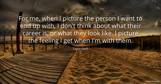 Swift, Taylor. (2026, January 18). For me, when I picture the person I want to end up with, I don't think about what their career is, or what they look like. I picture the feeling I get when I'm with them. FixQuotes. https://fixquotes.com/quotes/for-me-when-i-picture-the-person-i-want-to-end-up-1936/