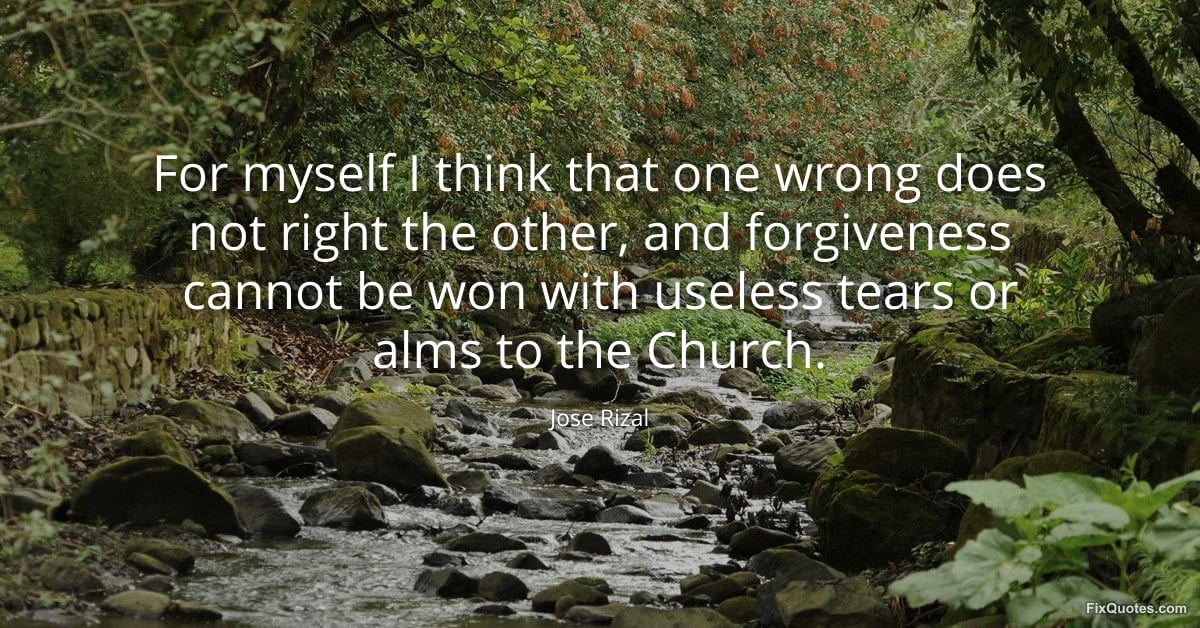 Rizal, Jose. (2026, February 10). For myself I think that one wrong does not right the other, and forgiveness cannot be won with useless tears or alms to the Church. FixQuotes. https://fixquotes.com/quotes/for-myself-i-think-that-one-wrong-does-not-right-185080/