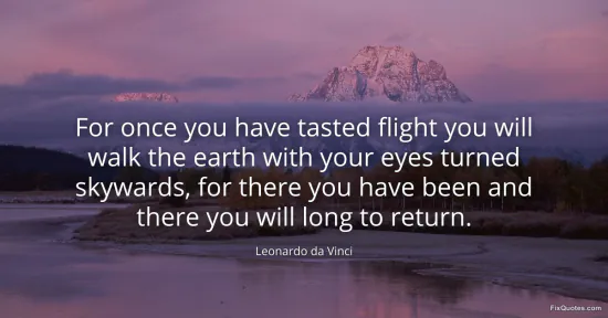 "For once you have tasted flight you will walk the earth with your eyes turned skywards, for there you have been and there you will long to return." FixQuotes, 15 Jan. 2026, https://fixquotes.com/quotes/for-once-you-have-tasted-flight-you-will-walk-the-22366/. Accessed 12 Feb. 2026.