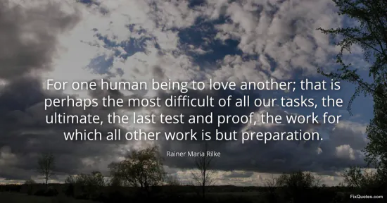 Rilke, Rainer Maria. "For one human being to love another; that is perhaps the most difficult of all our tasks, the ultimate, the last test and proof, the work for which all other work is but preparation." FixQuotes. January 18, 2026. https://fixquotes.com/quotes/for-one-human-being-to-love-another-that-is-14911/.