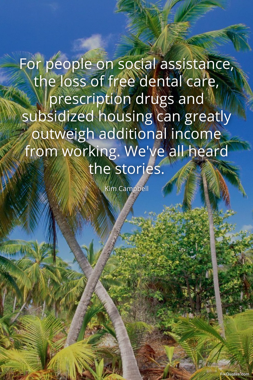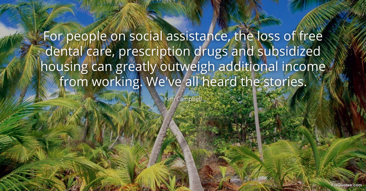 Campbell, Kim. "For people on social assistance, the loss of free dental care, prescription drugs and subsidized housing can greatly outweigh additional income from working. We've all heard the stories." FixQuotes. January 17, 2026. https://fixquotes.com/quotes/for-people-on-social-assistance-the-loss-of-free-73873/.