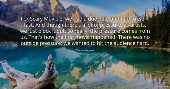 Wayans, Shawn. "For Scary Movie 2, we had a due date and had to work fast. And though there's a lot of pressure, as artists, we just block it out. So really, the pressure comes from us. That's how the first movie happened. There was no outside pressure: we wanted to hit the audience hard." FixQuotes. January 15, 2026. https://fixquotes.com/quotes/for-scary-movie-2-we-had-a-due-date-and-had-to-153283/.
