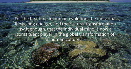 Thompson, William Irwin. "For the first time in human evolution, the individual life is long enough, and the cultural transformation swift enough, that the individual mind is now a constituent player in the global transformation of human culture." FixQuotes. January 17, 2026. https://fixquotes.com/quotes/for-the-first-time-in-human-evolution-the-73648/.