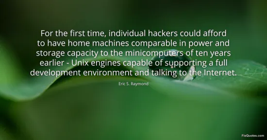 Raymond, Eric S. (2026, January 17). For the first time, individual hackers could afford to have home machines comparable in power and storage capacity to the minicomputers of ten years earlier - Unix engines capable of supporting a full development environment and talking to the Internet. FixQuotes. https://fixquotes.com/quotes/for-the-first-time-individual-hackers-could-70407/