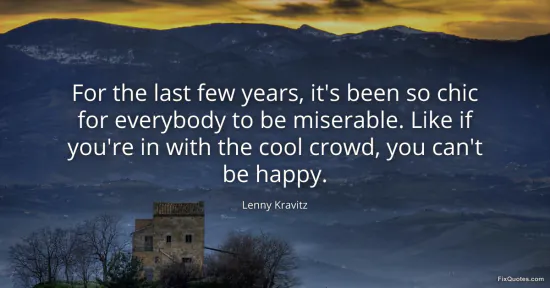 Kravitz, Lenny. (2026, January 17). For the last few years, it's been so chic for everybody to be miserable. Like if you're in with the cool crowd, you can't be happy. FixQuotes. https://fixquotes.com/quotes/for-the-last-few-years-its-been-so-chic-for-62439/