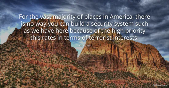 Bond, Kit. "For the vast majority of places in America, there is no way you can build a security system such as we have here because of the high priority this rates in terms of terrorist interests." FixQuotes. January 16, 2026. https://fixquotes.com/quotes/for-the-vast-majority-of-places-in-america-there-93178/.