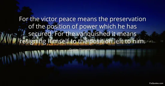 Stresemann, Gustav. "For the victor peace means the preservation of the position of power which he has secured. For the vanquished it means resigning himself to the position left to him." FixQuotes. January 15, 2026. https://fixquotes.com/quotes/for-the-victor-peace-means-the-preservation-of-67927/.
