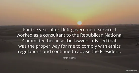 Hughes, Karen. (2026, January 16). For the year after I left government service, I worked as a consultant to the Republican National Committee because the lawyers advised that was the proper way for me to comply with ethics regulations and continue to advise the President. FixQuotes. https://fixquotes.com/quotes/for-the-year-after-i-left-government-service-i-95816/