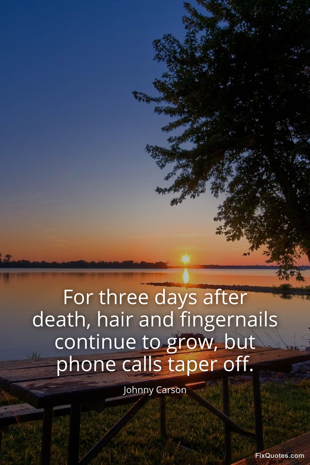 Carson, Johnny. "For three days after death, hair and fingernails continue to grow, but phone calls taper off." FixQuotes. February 16, 2026. https://fixquotes.com/quotes/for-three-days-after-death-hair-and-fingernails-117931/.