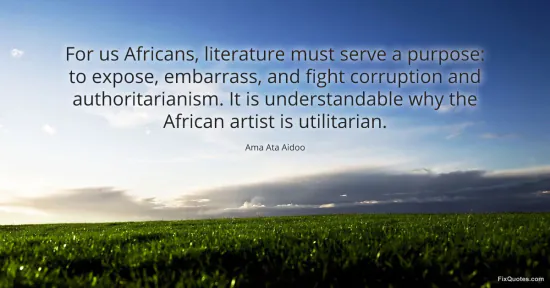 Aidoo, Ama Ata. "For us Africans, literature must serve a purpose: to expose, embarrass, and fight corruption and authoritarianism. It is understandable why the African artist is utilitarian." FixQuotes. January 16, 2026. https://fixquotes.com/quotes/for-us-africans-literature-must-serve-a-purpose-121515/.
