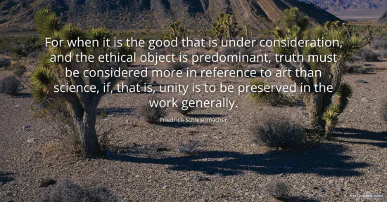 Schleiermacher, Friedrich. (2026, January 18). For when it is the good that is under consideration, and the ethical object is predominant, truth must be considered more in reference to art than science, if, that is, unity is to be preserved in the work generally. FixQuotes. https://fixquotes.com/quotes/for-when-it-is-the-good-that-is-under-3073/