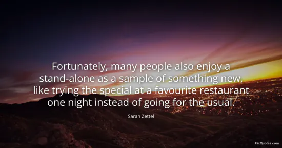 Zettel, Sarah. "Fortunately, many people also enjoy a stand-alone as a sample of something new, like trying the special at a favourite restaurant one night instead of going for the usual." FixQuotes. January 16, 2026. https://fixquotes.com/quotes/fortunately-many-people-also-enjoy-a-stand-alone-86201/.