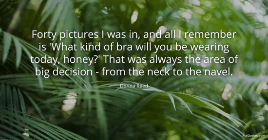 Reed, Donna. "Forty pictures I was in, and all I remember is 'What kind of bra will you be wearing today, honey?' That was always the area of big decision - from the neck to the navel." FixQuotes. January 15, 2026. https://fixquotes.com/quotes/forty-pictures-i-was-in-and-all-i-remember-is-162068/.