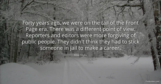 Royko, Mike. (2026, January 15). Forty years ago, we were on the tail of the Front Page era. There was a different point of view. Reporters and editors were more forgiving of public people. They didn't think they had to stick someone in jail to make a career. FixQuotes. https://fixquotes.com/quotes/forty-years-ago-we-were-on-the-tail-of-the-front-162941/