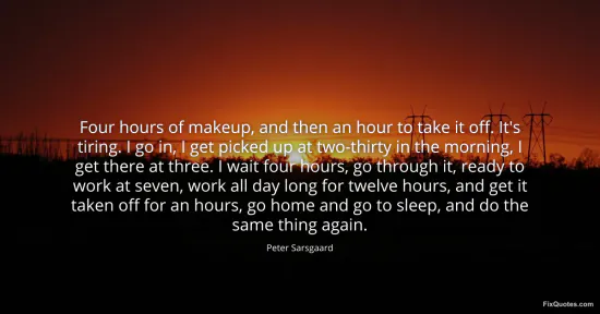 Sarsgaard, Peter. (2026, January 16). Four hours of makeup, and then an hour to take it off. It's tiring. I go in, I get picked up at two-thirty in the morning, I get there at three. I wait four hours, go through it, ready to work at seven, work all day long for twelve hours, and get it taken off for an hours, go home and go to sleep, and do the same thing again. FixQuotes. https://fixquotes.com/quotes/four-hours-of-makeup-and-then-an-hour-to-take-it-128320/