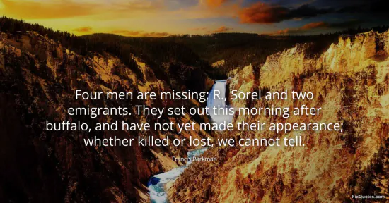 Parkman, Francis. (2026, January 17). Four men are missing; R., Sorel and two emigrants. They set out this morning after buffalo, and have not yet made their appearance; whether killed or lost, we cannot tell. FixQuotes. https://fixquotes.com/quotes/four-men-are-missing-r-sorel-and-two-emigrants-52771/