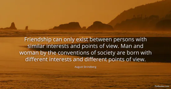 Strindberg, August. "Friendship can only exist between persons with similar interests and points of view. Man and woman by the conventions of society are born with different interests and different points of view." FixQuotes. January 15, 2026. https://fixquotes.com/quotes/friendship-can-only-exist-between-persons-with-121866/.