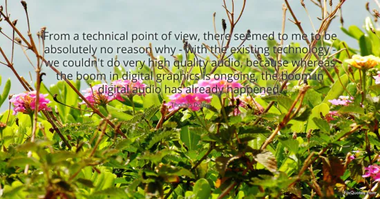 "From a technical point of view, there seemed to me to be absolutely no reason why - with the existing technology - we couldn't do very high quality audio, because whereas the boom in digital graphics is ongoing, the boom in digital audio has already happened." FixQuotes, 16 Jan. 2026, https://fixquotes.com/quotes/from-a-technical-point-of-view-there-seemed-to-me-90484/. Accessed 13 Feb. 2026.