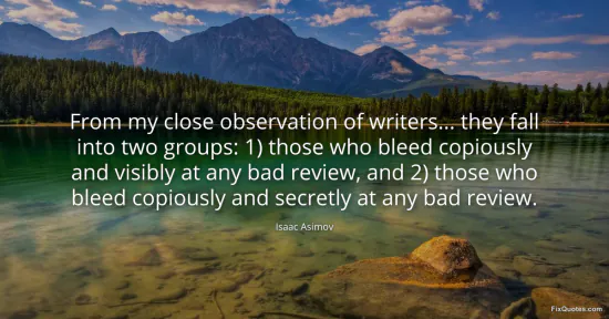 Asimov, Isaac. (2026, January 15). From my close observation of writers... they fall into two groups: 1) those who bleed copiously and visibly at any bad review, and 2) those who bleed copiously and secretly at any bad review. FixQuotes. https://fixquotes.com/quotes/from-my-close-observation-of-writers-they-fall-31609/
