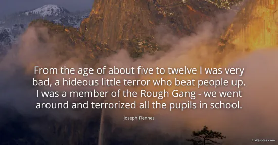 Fiennes, Joseph. "From the age of about five to twelve I was very bad, a hideous little terror who beat people up. I was a member of the Rough Gang - we went around and terrorized all the pupils in school." FixQuotes. January 16, 2026. https://fixquotes.com/quotes/from-the-age-of-about-five-to-twelve-i-was-very-98662/.