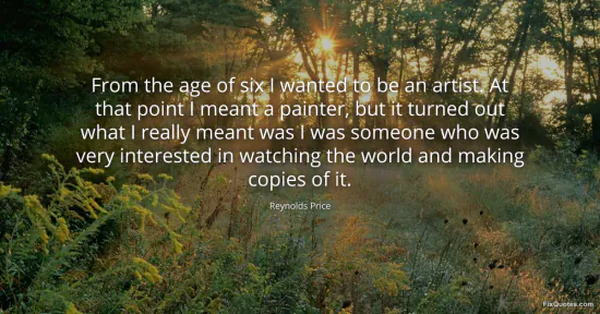 Price, Reynolds. "From the age of six I wanted to be an artist. At that point I meant a painter, but it turned out what I really meant was I was someone who was very interested in watching the world and making copies of it." FixQuotes. January 16, 2026. https://fixquotes.com/quotes/from-the-age-of-six-i-wanted-to-be-an-artist-at-135850/.