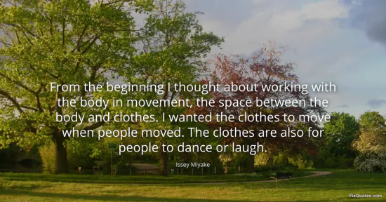 Miyake, Issey. "From the beginning I thought about working with the body in movement, the space between the body and clothes. I wanted the clothes to move when people moved. The clothes are also for people to dance or laugh." FixQuotes. January 15, 2026. https://fixquotes.com/quotes/from-the-beginning-i-thought-about-working-with-146884/.