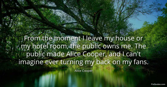 Cooper, Alice. "From the moment I leave my house or my hotel room, the public owns me. The public made Alice Cooper, and I can't imagine ever turning my back on my fans." FixQuotes. February 19, 2026. https://fixquotes.com/quotes/from-the-moment-i-leave-my-house-or-my-hotel-room-44946/.