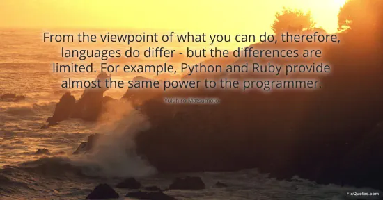 Matsumoto, Yukihiro. (2026, January 16). From the viewpoint of what you can do, therefore, languages do differ - but the differences are limited. For example, Python and Ruby provide almost the same power to the programmer. FixQuotes. https://fixquotes.com/quotes/from-the-viewpoint-of-what-you-can-do-therefore-117981/