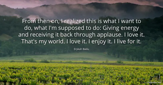 Badu, Erykah. (2026, January 17). From then on, I realized this is what I want to do, what I'm supposed to do: Giving energy and receiving it back through applause. I love it. That's my world. I love it. I enjoy it. I live for it. FixQuotes. https://fixquotes.com/quotes/from-then-on-i-realized-this-is-what-i-want-to-do-57456/