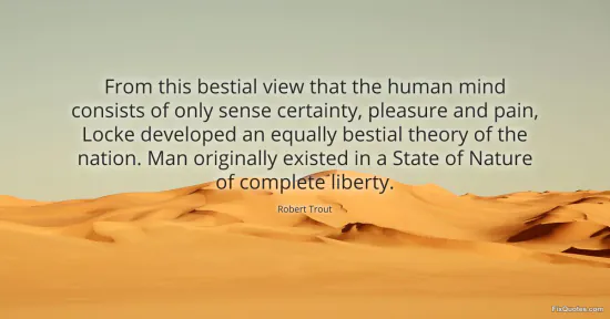 Trout, Robert. "From this bestial view that the human mind consists of only sense certainty, pleasure and pain, Locke developed an equally bestial theory of the nation. Man originally existed in a State of Nature of complete liberty." FixQuotes. January 16, 2026. https://fixquotes.com/quotes/from-this-bestial-view-that-the-human-mind-89500/.