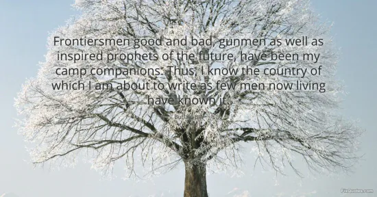"Frontiersmen good and bad, gunmen as well as inspired prophets of the future, have been my camp companions. Thus, I know the country of which I am about to write as few men now living have known it." FixQuotes, https://fixquotes.com/quotes/frontiersmen-good-and-bad-gunmen-as-well-as-22592/. Accessed 2 Feb. 2026.