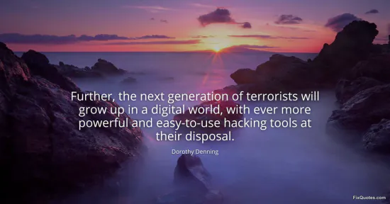 Denning, Dorothy. (2026, January 15). Further, the next generation of terrorists will grow up in a digital world, with ever more powerful and easy-to-use hacking tools at their disposal. FixQuotes. https://fixquotes.com/quotes/further-the-next-generation-of-terrorists-will-148855/
