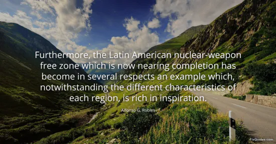 Robles, Alfonso G. "Furthermore, the Latin American nuclear-weapon free zone which is now nearing completion has become in several respects an example which, notwithstanding the different characteristics of each region, is rich in inspiration." FixQuotes. January 17, 2026. https://fixquotes.com/quotes/furthermore-the-latin-american-nuclear-weapon-43344/.