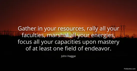 Haggai, John. "Gather in your resources, rally all your faculties, marshal all your energies, focus all your capacities upon mastery of at least one field of endeavor." FixQuotes. January 17, 2026. https://fixquotes.com/quotes/gather-in-your-resources-rally-all-your-faculties-69256/.