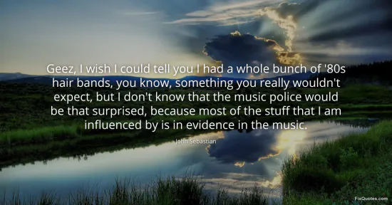 Sebastian, John. "Geez, I wish I could tell you I had a whole bunch of '80s hair bands, you know, something you really wouldn't expect, but I don't know that the music police would be that surprised, because most of the stuff that I am influenced by is in evidence in the music." FixQuotes. February 16, 2026. https://fixquotes.com/quotes/geez-i-wish-i-could-tell-you-i-had-a-whole-bunch-135389/.
