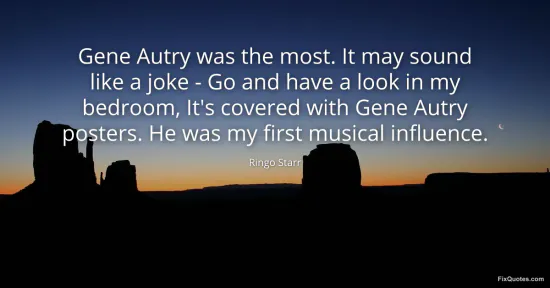 Starr, Ringo. "Gene Autry was the most. It may sound like a joke - Go and have a look in my bedroom, It's covered with Gene Autry posters. He was my first musical influence." FixQuotes. January 15, 2026. https://fixquotes.com/quotes/gene-autry-was-the-most-it-may-sound-like-a-joke-145009/.