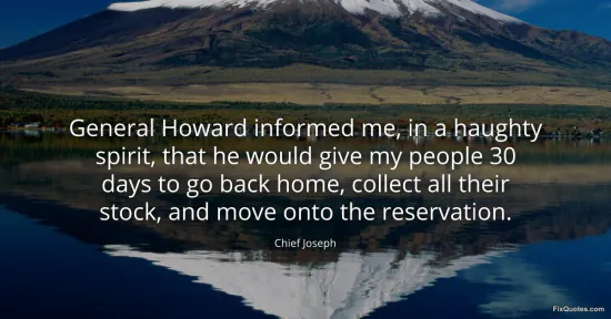 Joseph, Chief. "General Howard informed me, in a haughty spirit, that he would give my people 30 days to go back home, collect all their stock, and move onto the reservation." FixQuotes. January 15, 2026. https://fixquotes.com/quotes/general-howard-informed-me-in-a-haughty-spirit-30557/.