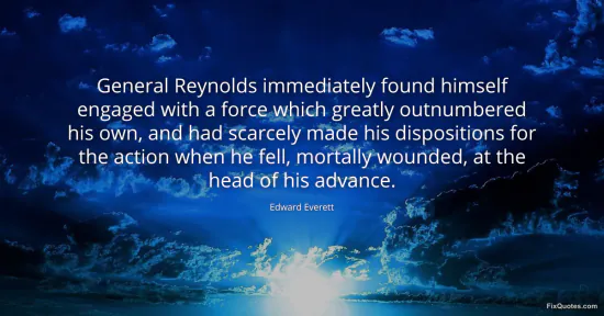 Everett, Edward. "General Reynolds immediately found himself engaged with a force which greatly outnumbered his own, and had scarcely made his dispositions for the action when he fell, mortally wounded, at the head of his advance." FixQuotes. January 17, 2026. https://fixquotes.com/quotes/general-reynolds-immediately-found-himself-50808/.